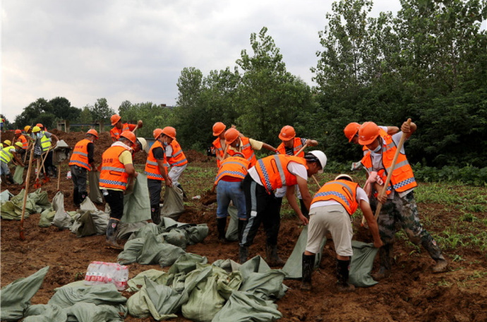 武漢建工集團防汛搶險第一分隊的260多位隊員與數(shù)十臺搶險車輛及機械設(shè)備,在武漢市東西湖區(qū)濱河南路集結(jié)待命。